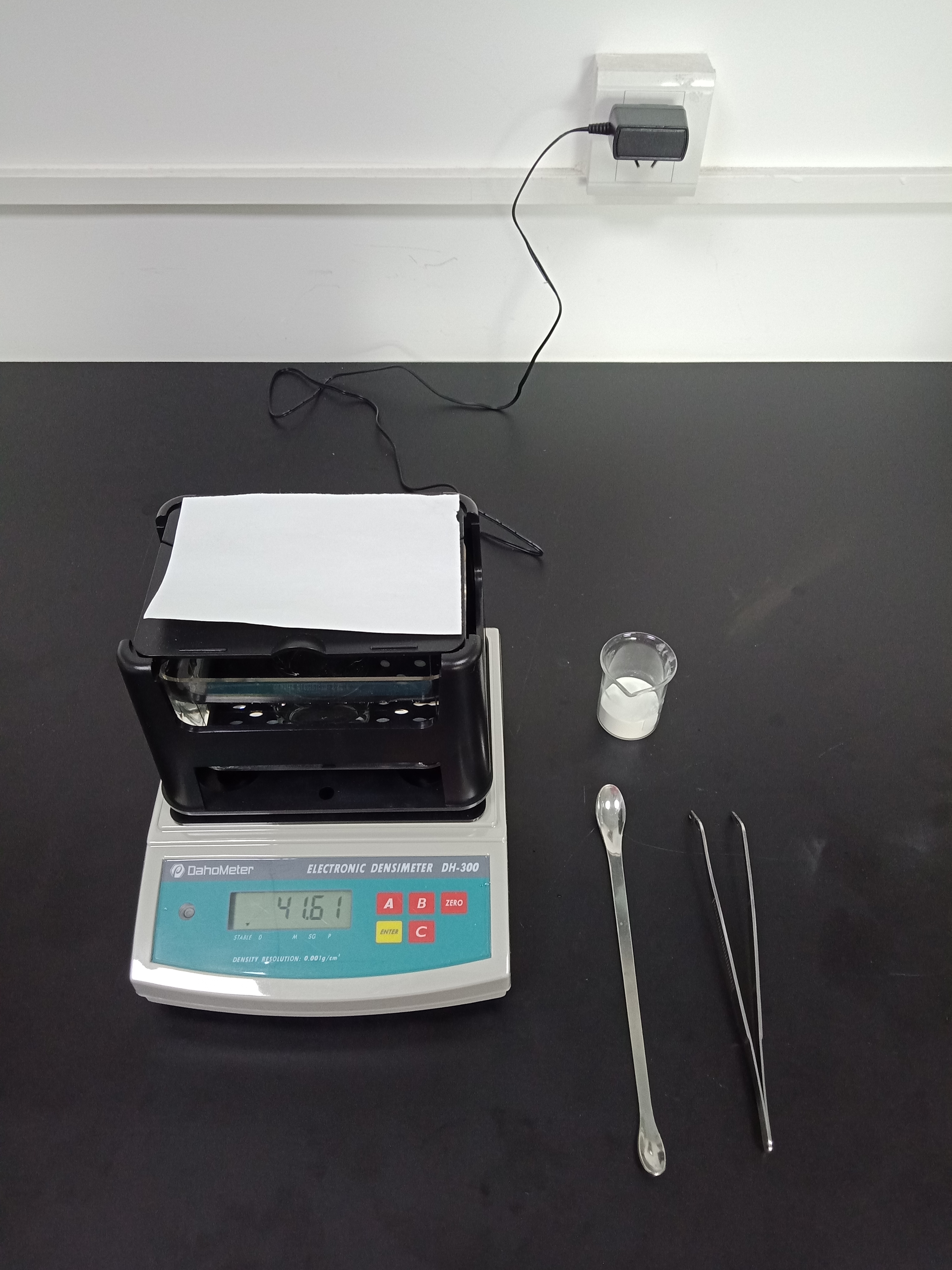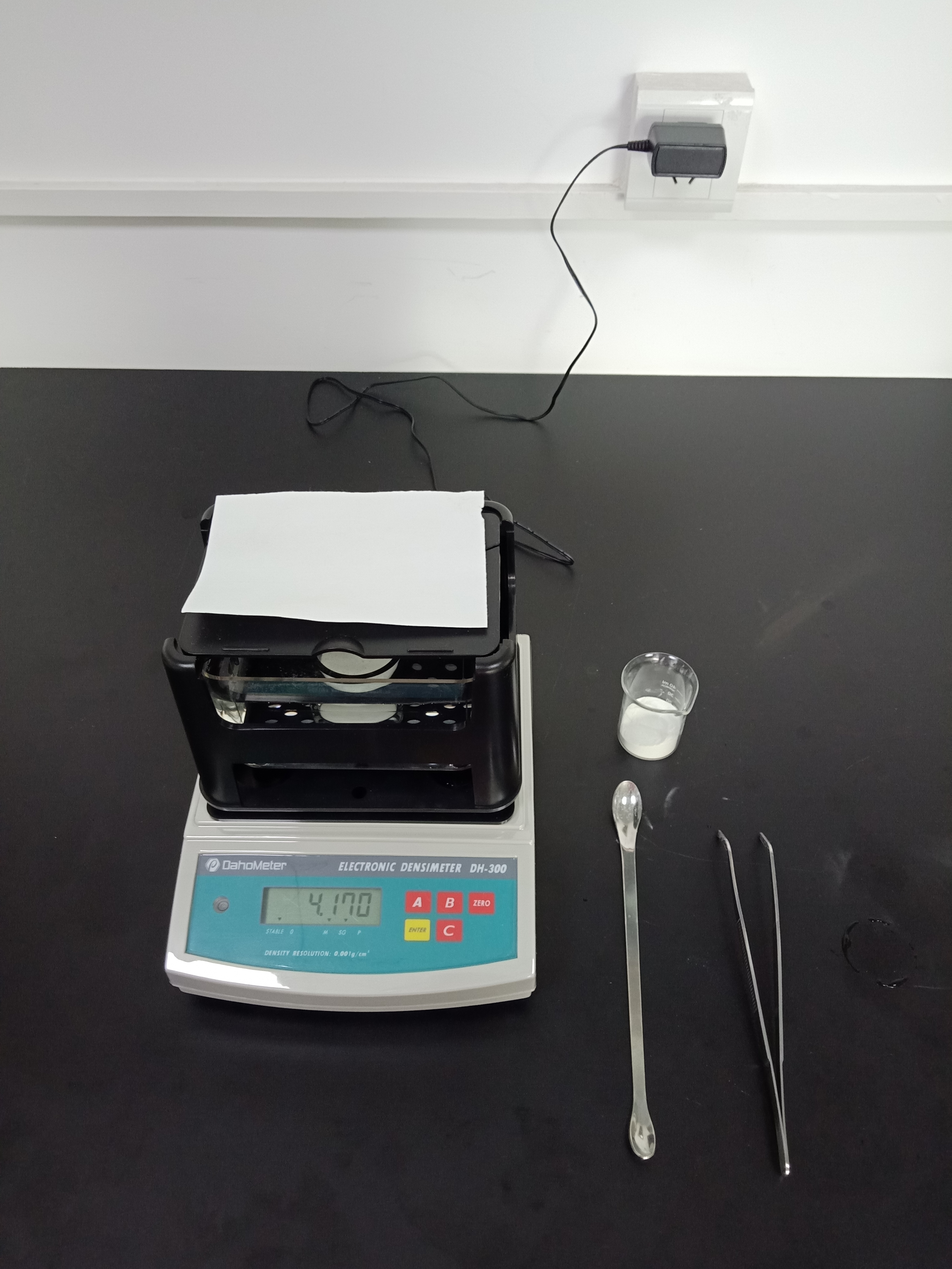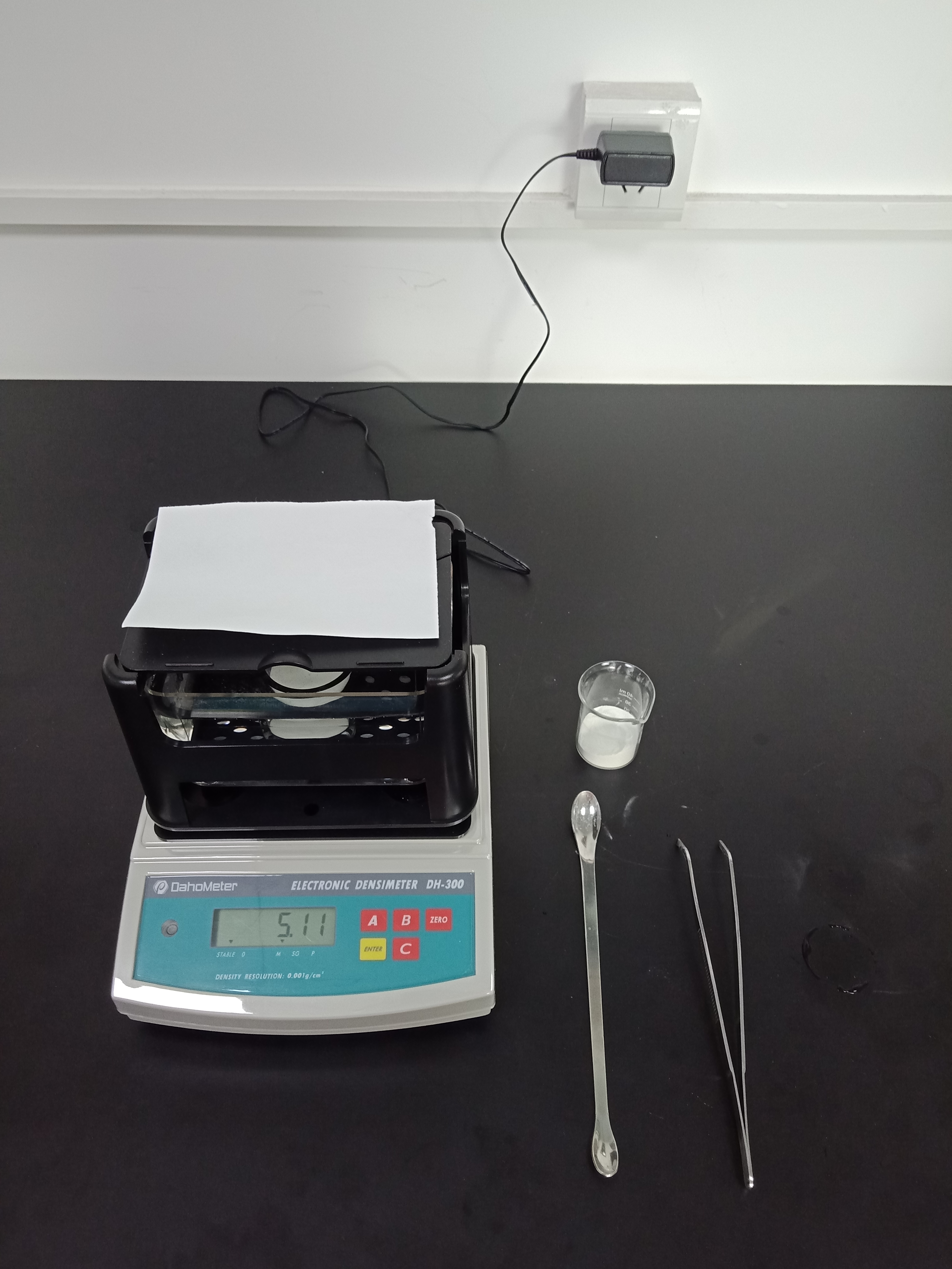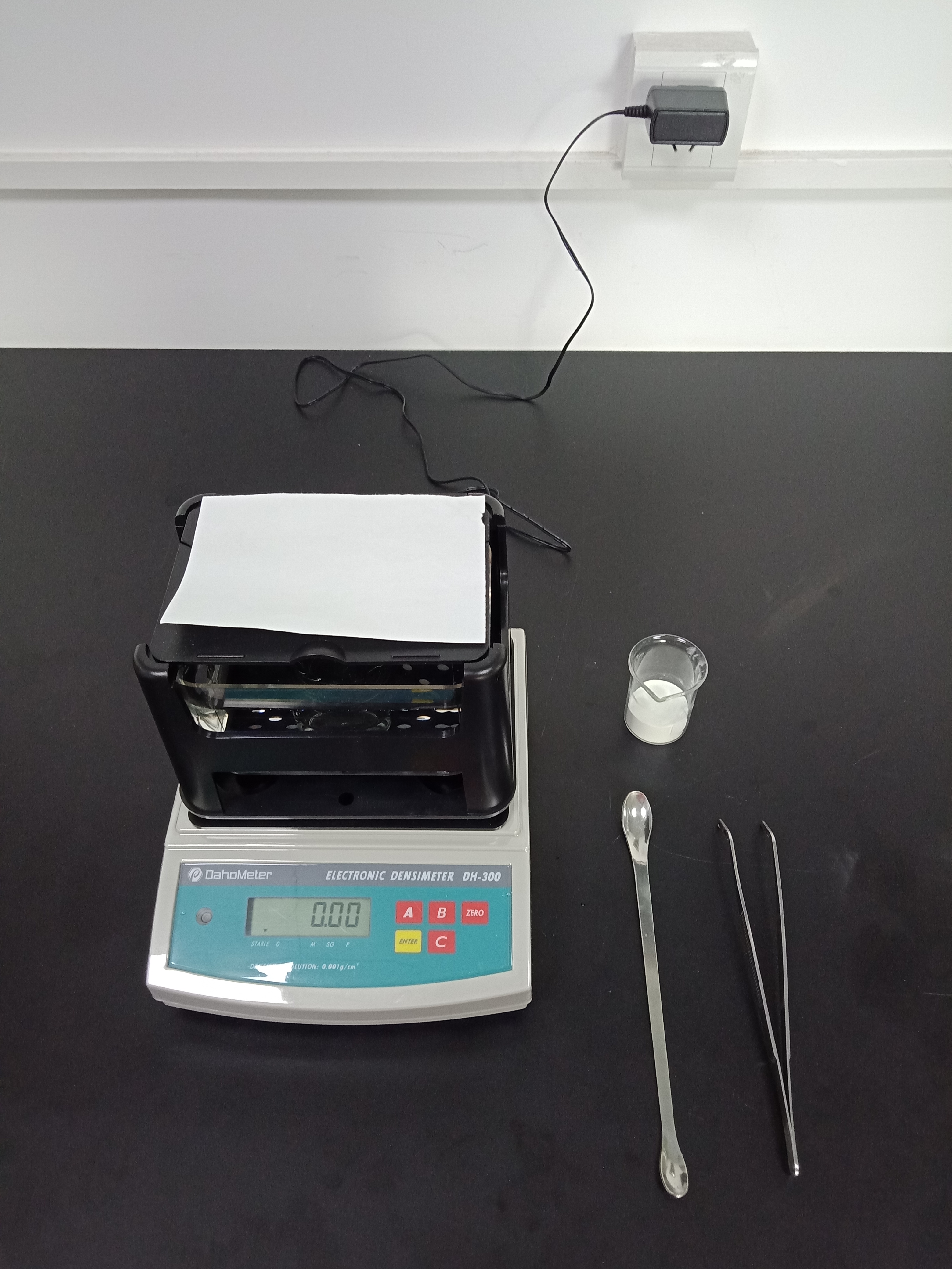 1,準(zhǔn)備好測試儀器DH-300,測試樣品和測試工具小玻璃杯一個,鑷子一把,勺子一個,測試用紙一張(如圖1)