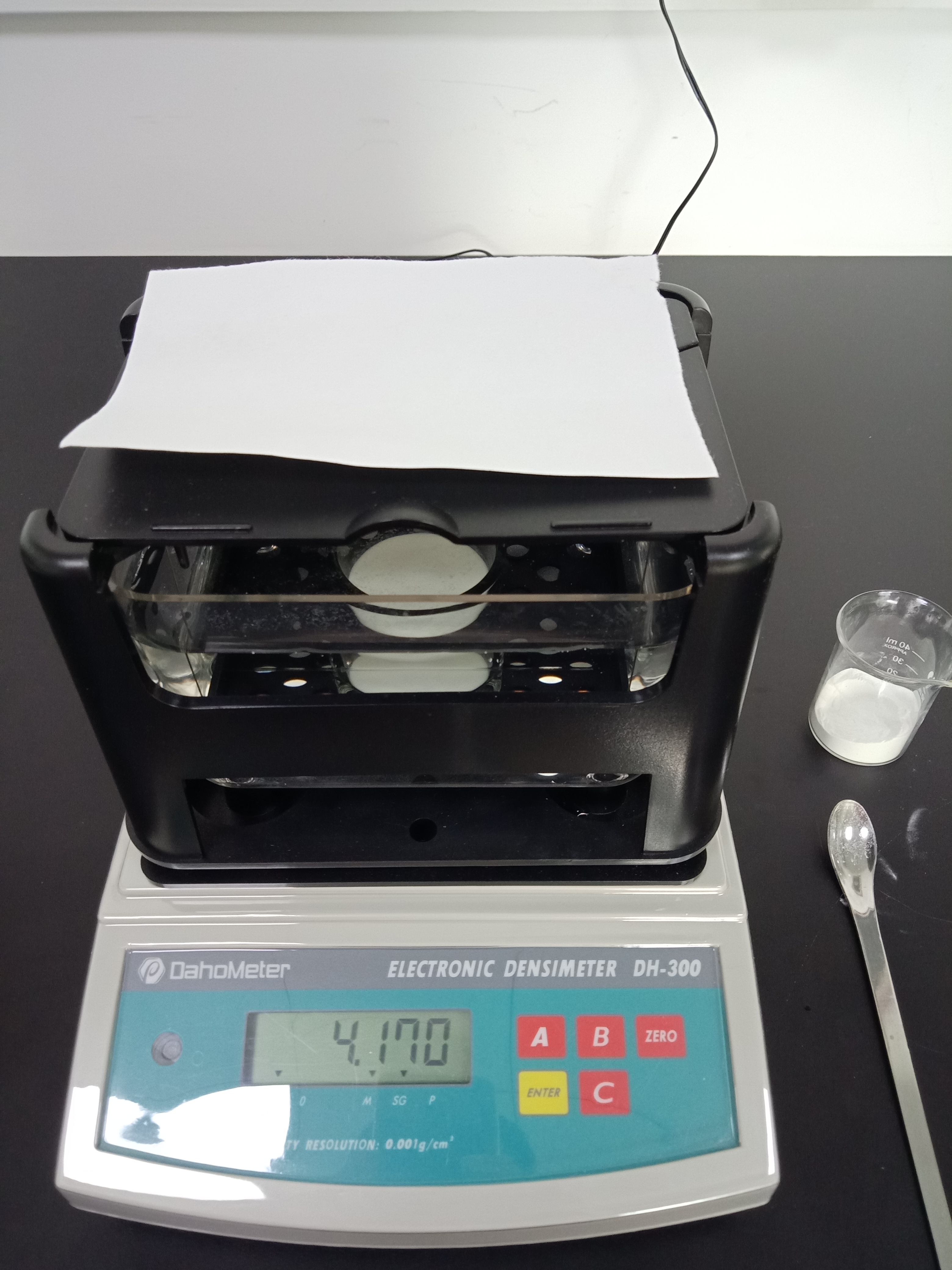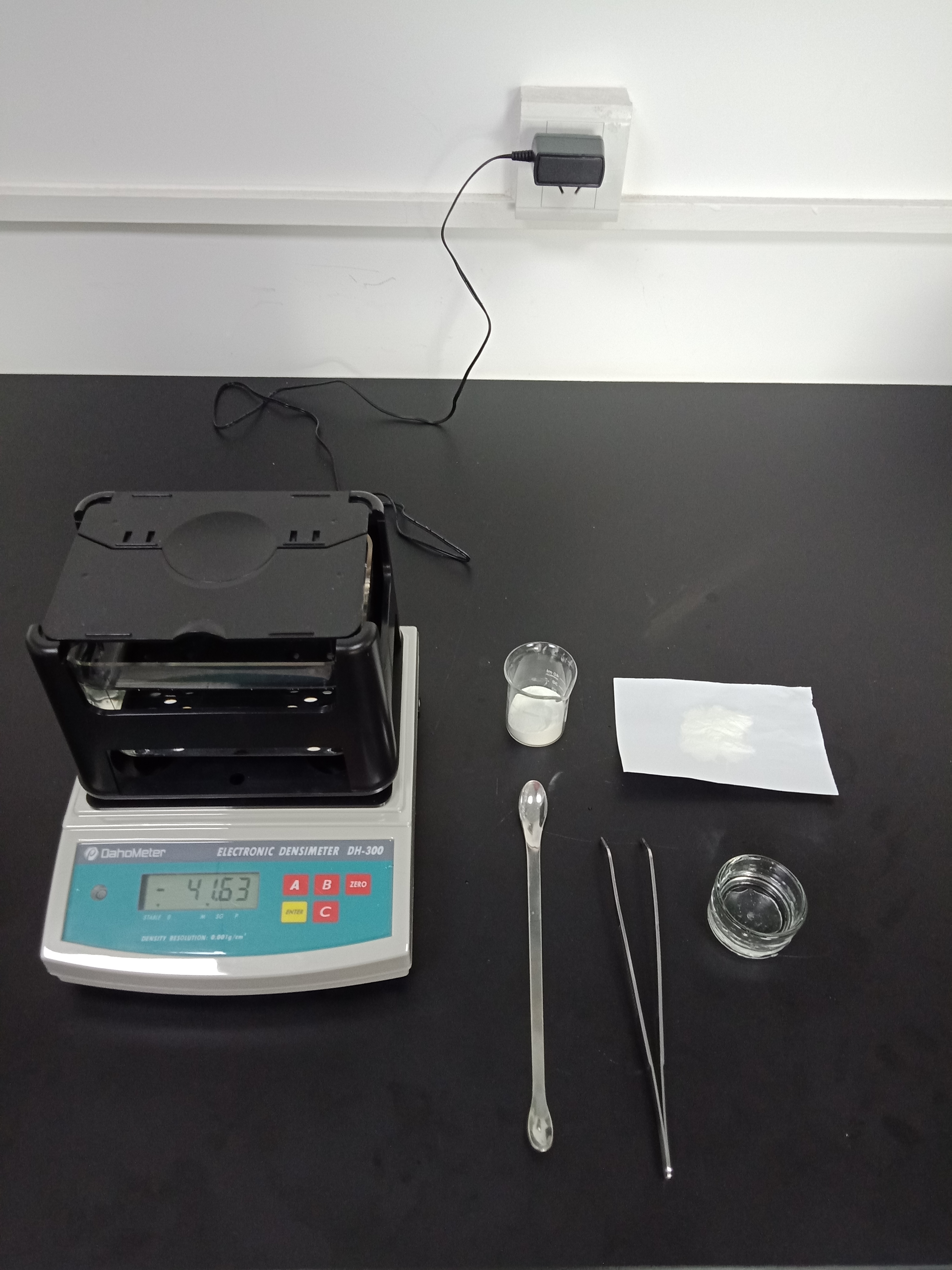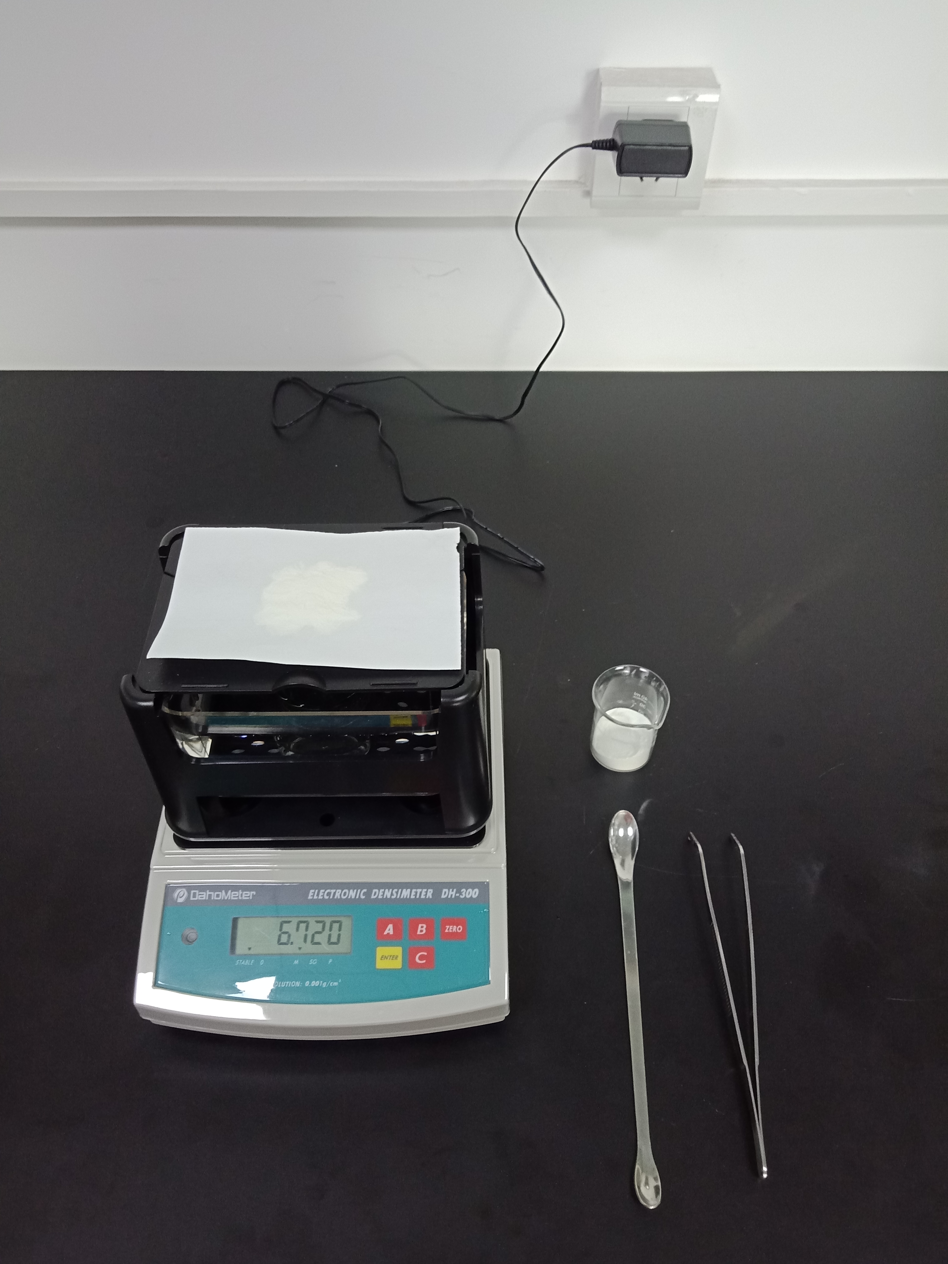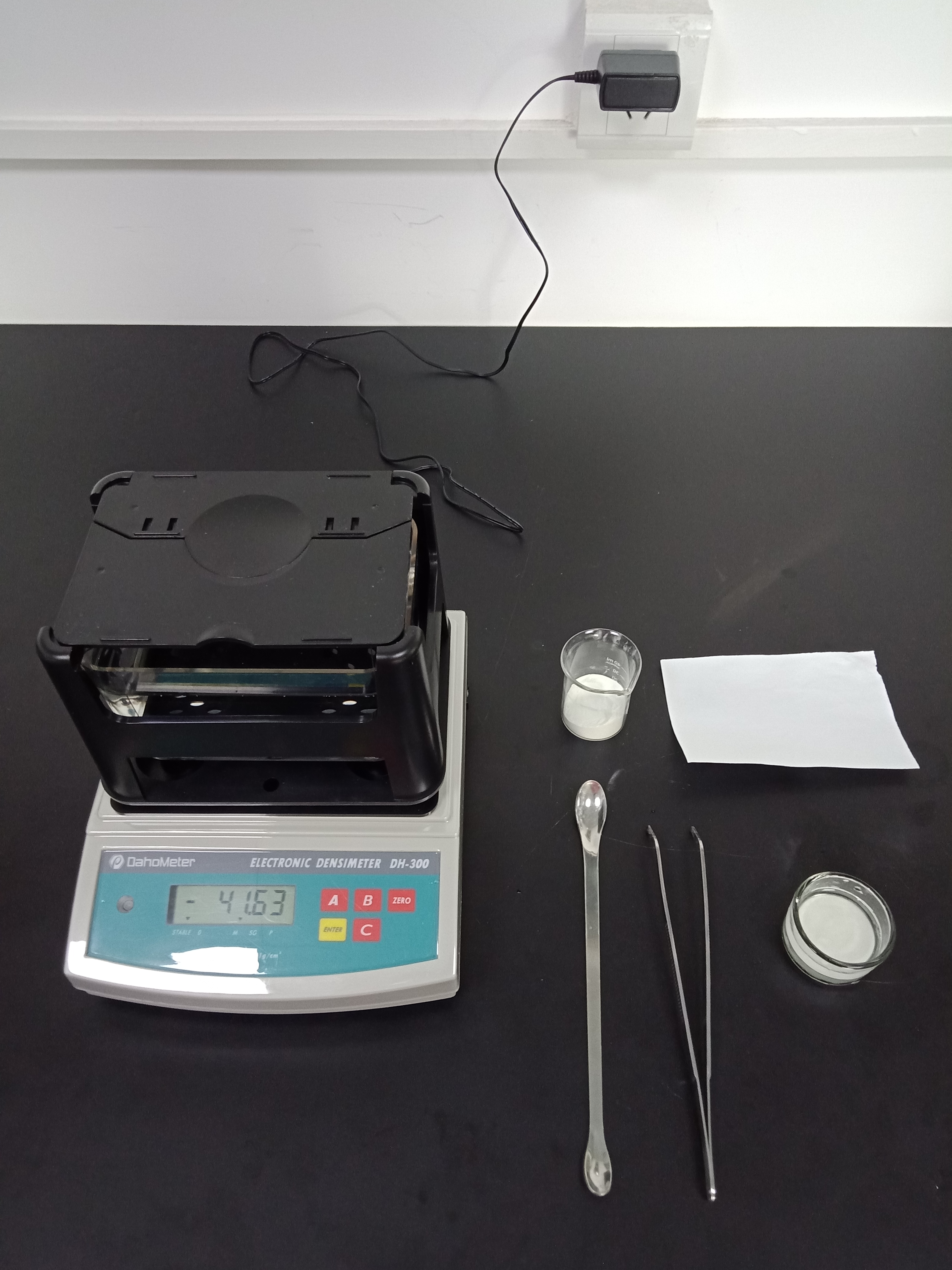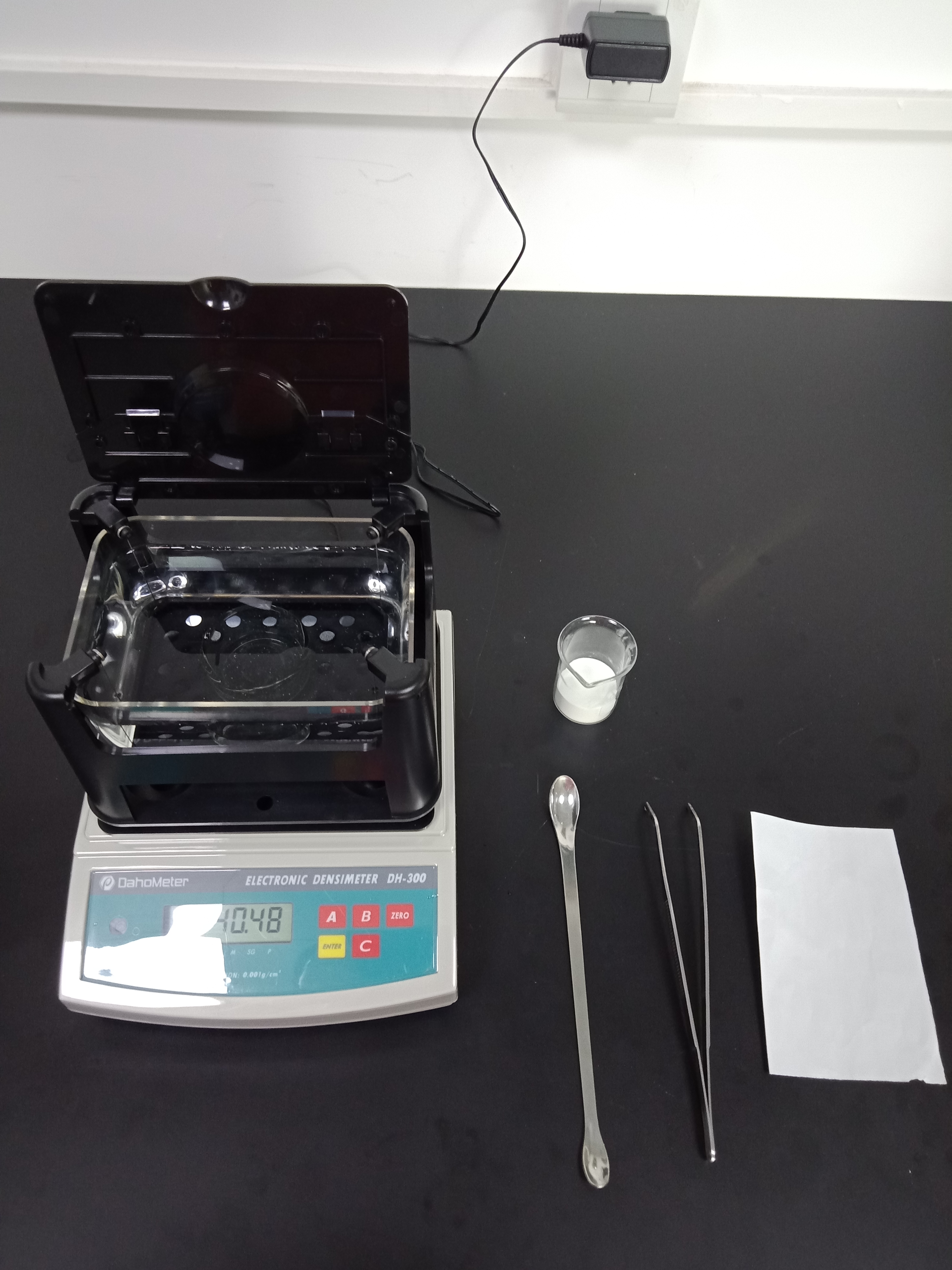 1,準(zhǔn)備好測試儀器DH-300,測試樣品和測試工具小玻璃杯一個,鑷子一把,勺子一個,測試用紙一張(如圖1)
