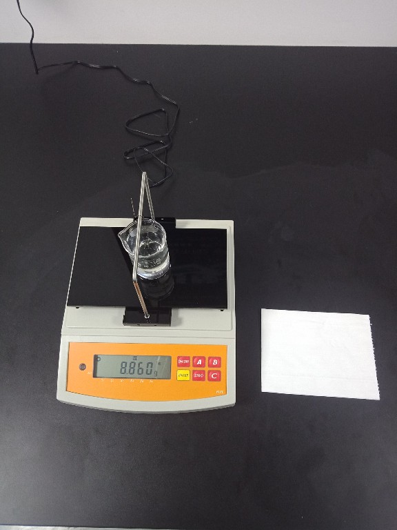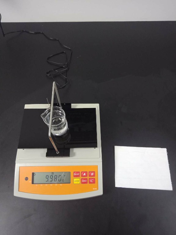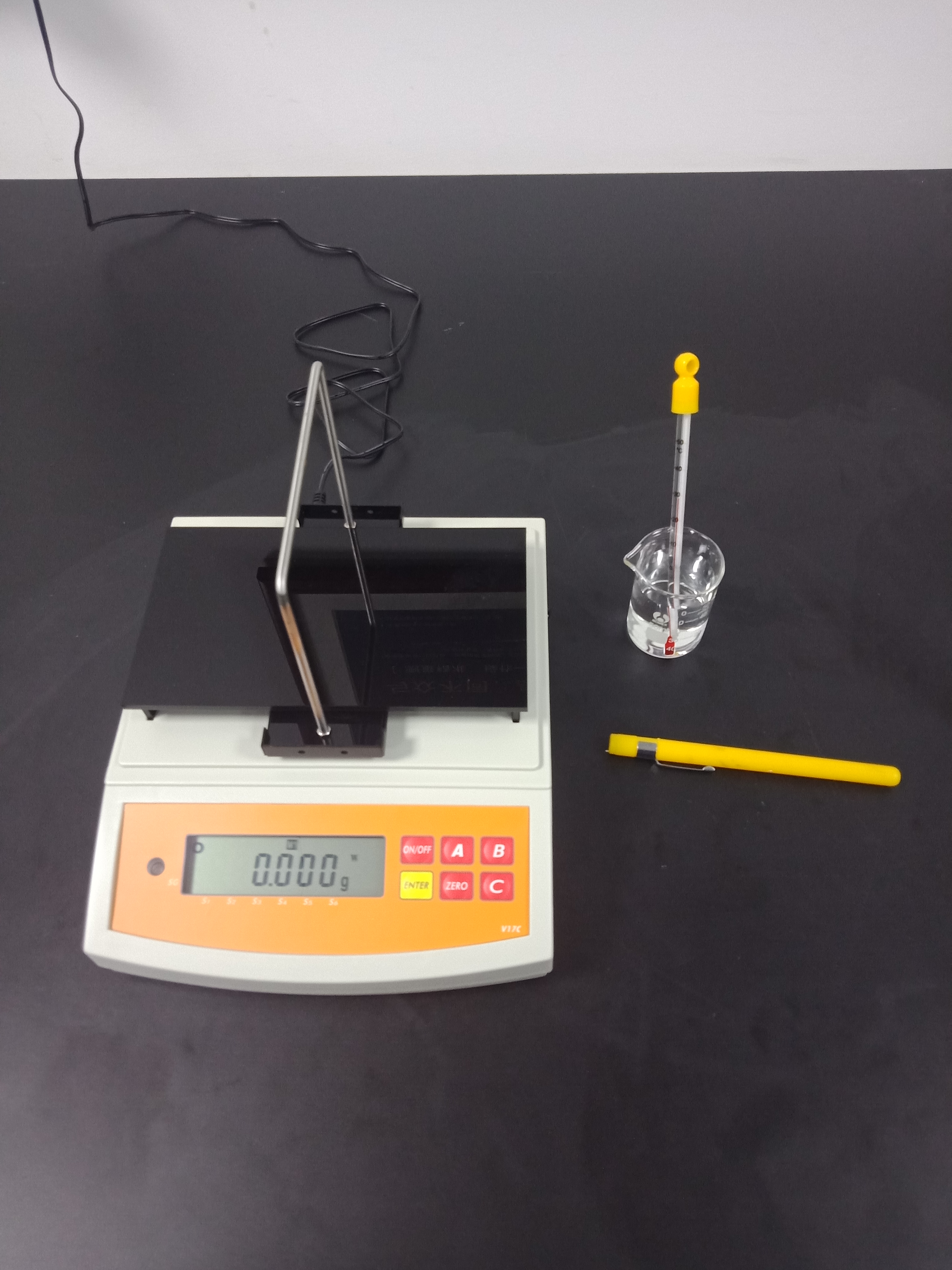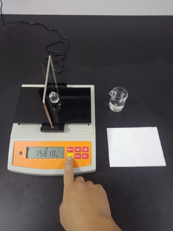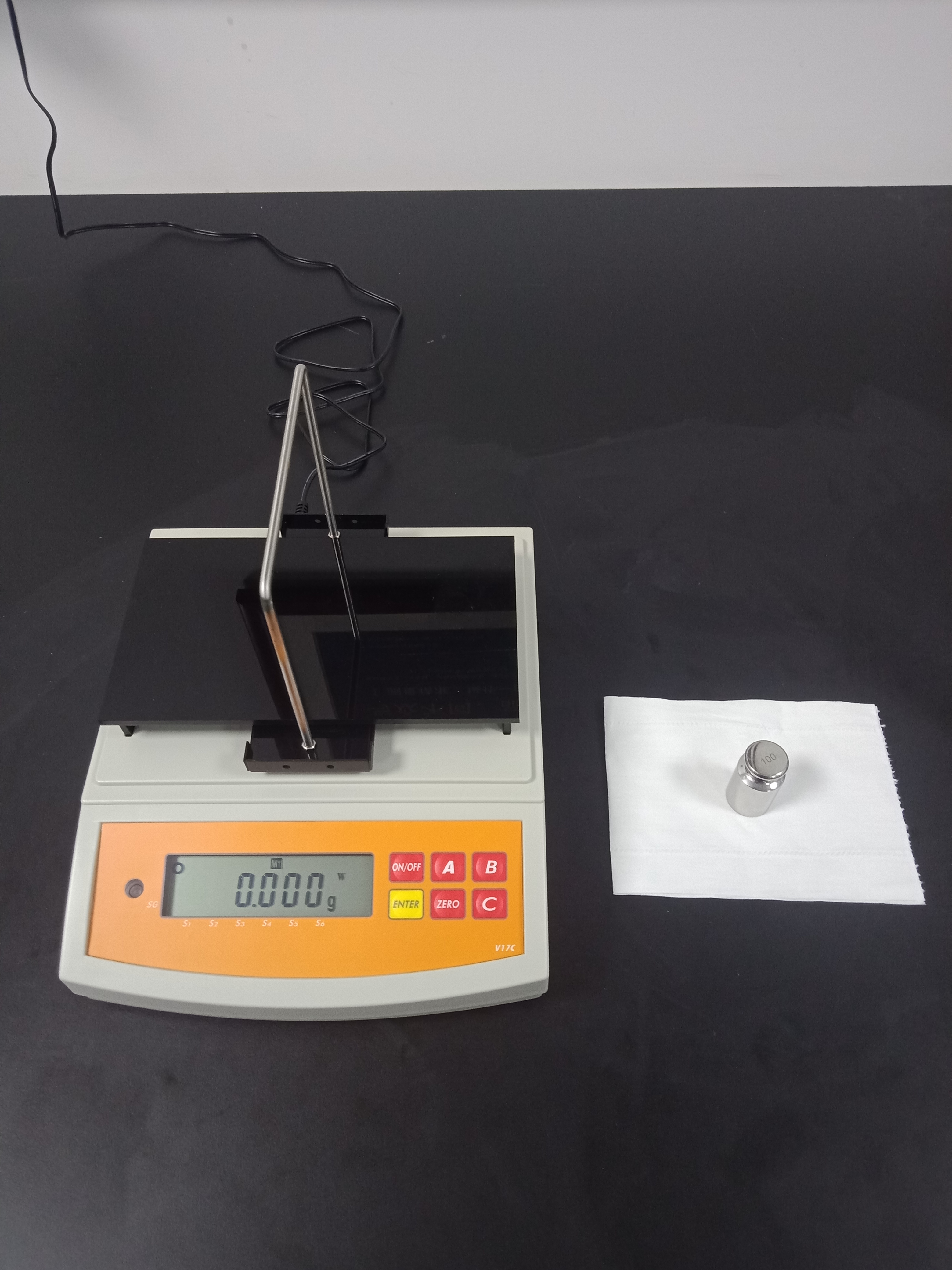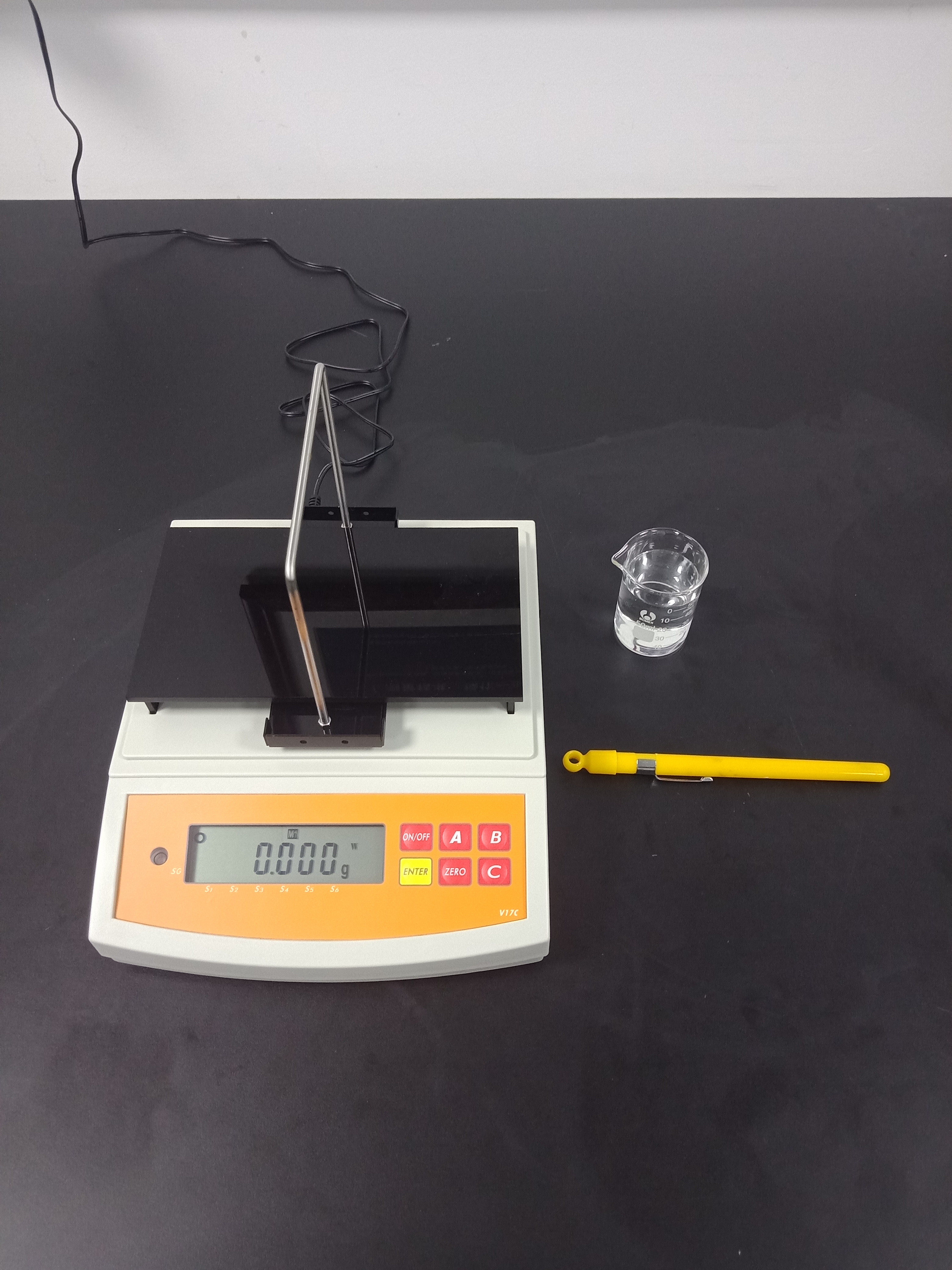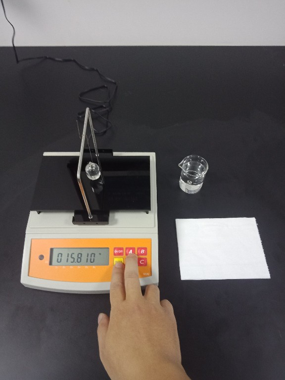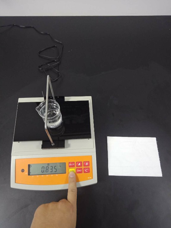3),記錄好測試結果后,再按一次【ENTER】鍵返回待測模式,并將已測液體樣品,掛鉤和測試用砝碼取下,結束此次測試,如下圖