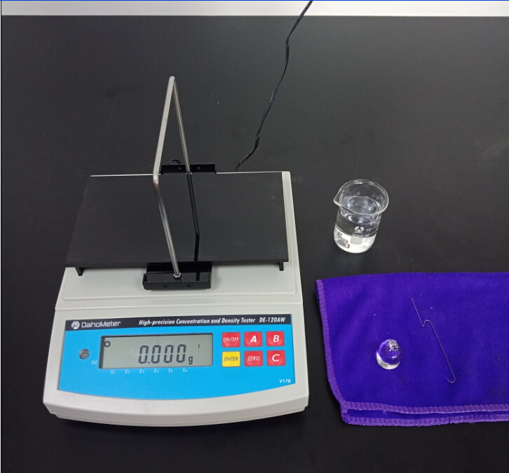 1,準備一杯50ml常溫的純凈水,測試用玻璃砝碼一個,掛鉤一個;
