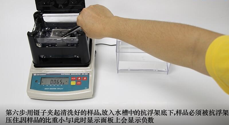 第六步:用鑷子夾起清洗好的樣品,放入水槽中的抗浮架底下,樣品必須被抗浮架壓住,因樣品的比重小與1此時(shí)顯示面板上會(huì)顯示負(fù)數(shù)。如圖
