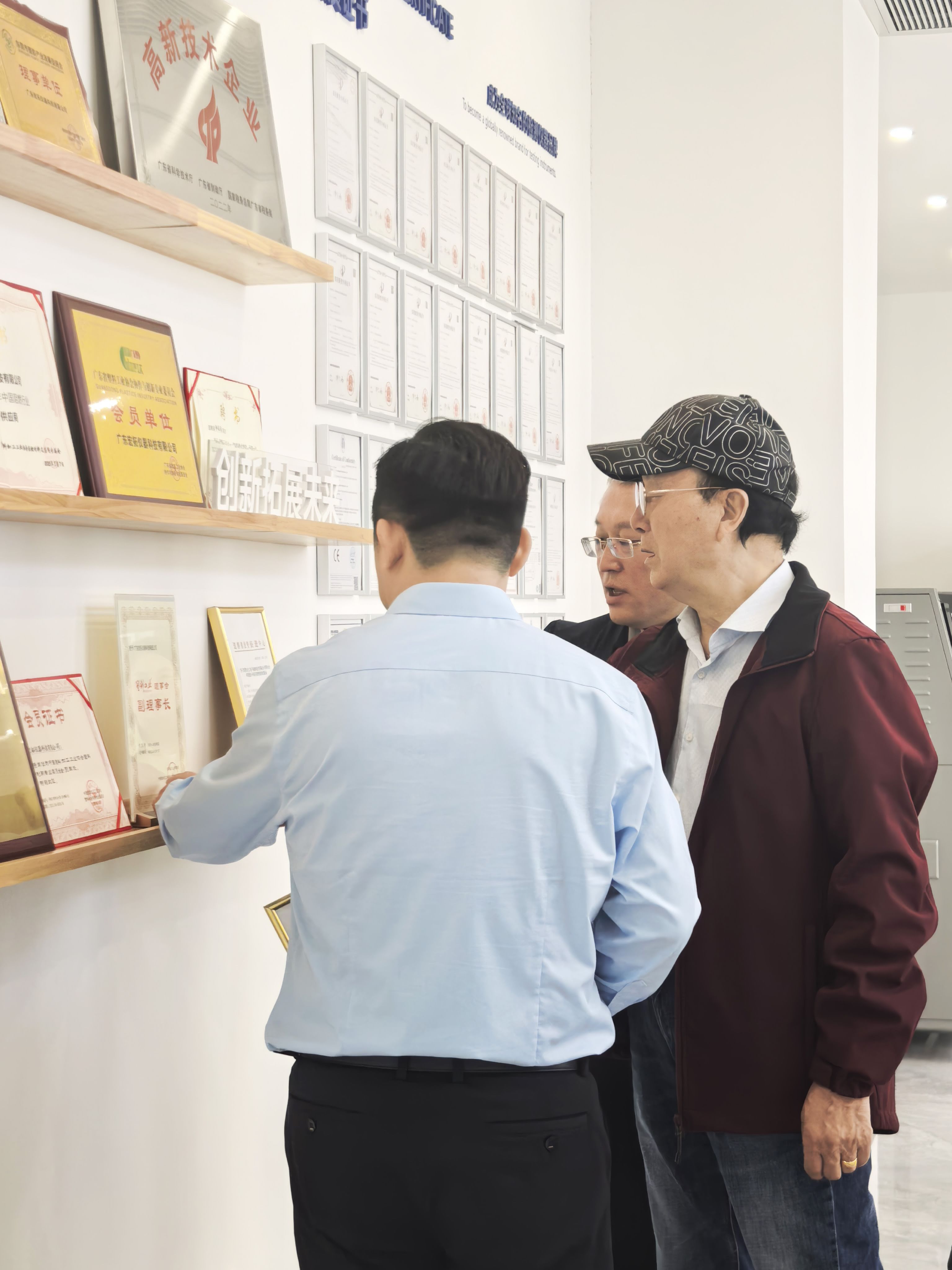 塑料協(xié)會領(lǐng)導(dǎo)們在鐘董的陪同下,首先參觀宏拓儀器數(shù)字化展廳。通過鐘董的熱情講解,塑料協(xié)會領(lǐng)導(dǎo)們?nèi)媪私夂晖貎x器從企業(yè)初創(chuàng)到技術(shù)突破和榮譽(yù)沉淀的成長歷程,國家級高新技術(shù)企業(yè)、科技型中小企業(yè)、創(chuàng)新型中小企業(yè)、廣東塑協(xié)塑料檢測技術(shù)咨詢服務(wù)中心等等,滿滿一面墻的榮譽(yù)資質(zhì)是宏拓儀器多年來在技術(shù)研發(fā)、產(chǎn)品創(chuàng)新以及標(biāo)準(zhǔn)化建設(shè)等方面持續(xù)投入和取得卓越成果的集中體現(xiàn)。