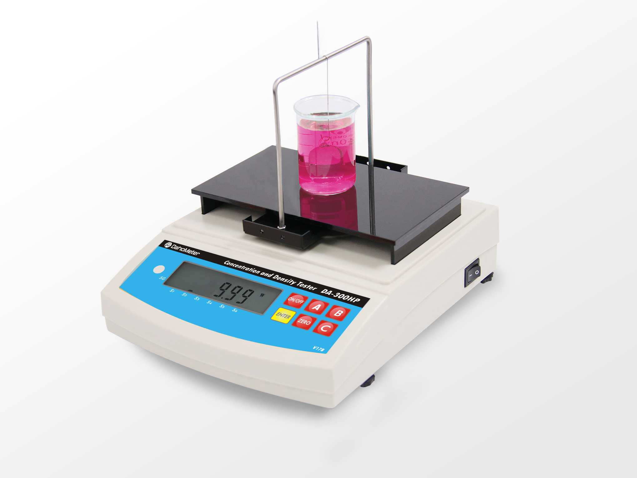 2、將標準砝碼浸沒在樣品中并用掛鉤懸掛于測量架中央,顯示即為雙氧水濃度,標示符號指向S2